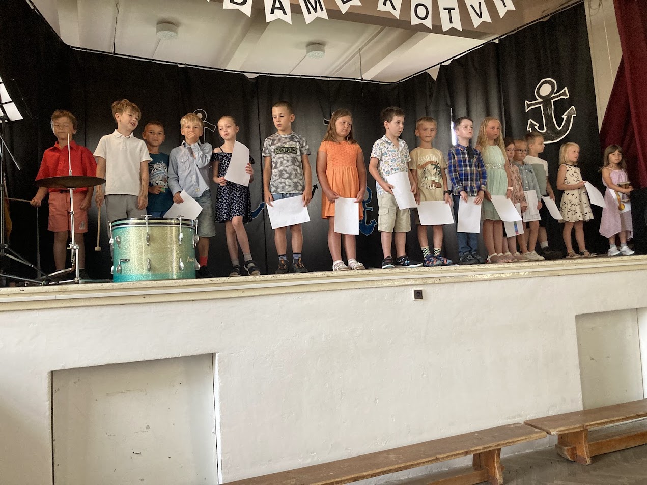 Na sále školy proběhlo slavnostní zakončení školního roku, na které si většina tříd připravila pro ostatní žáky krátké vystoupení.